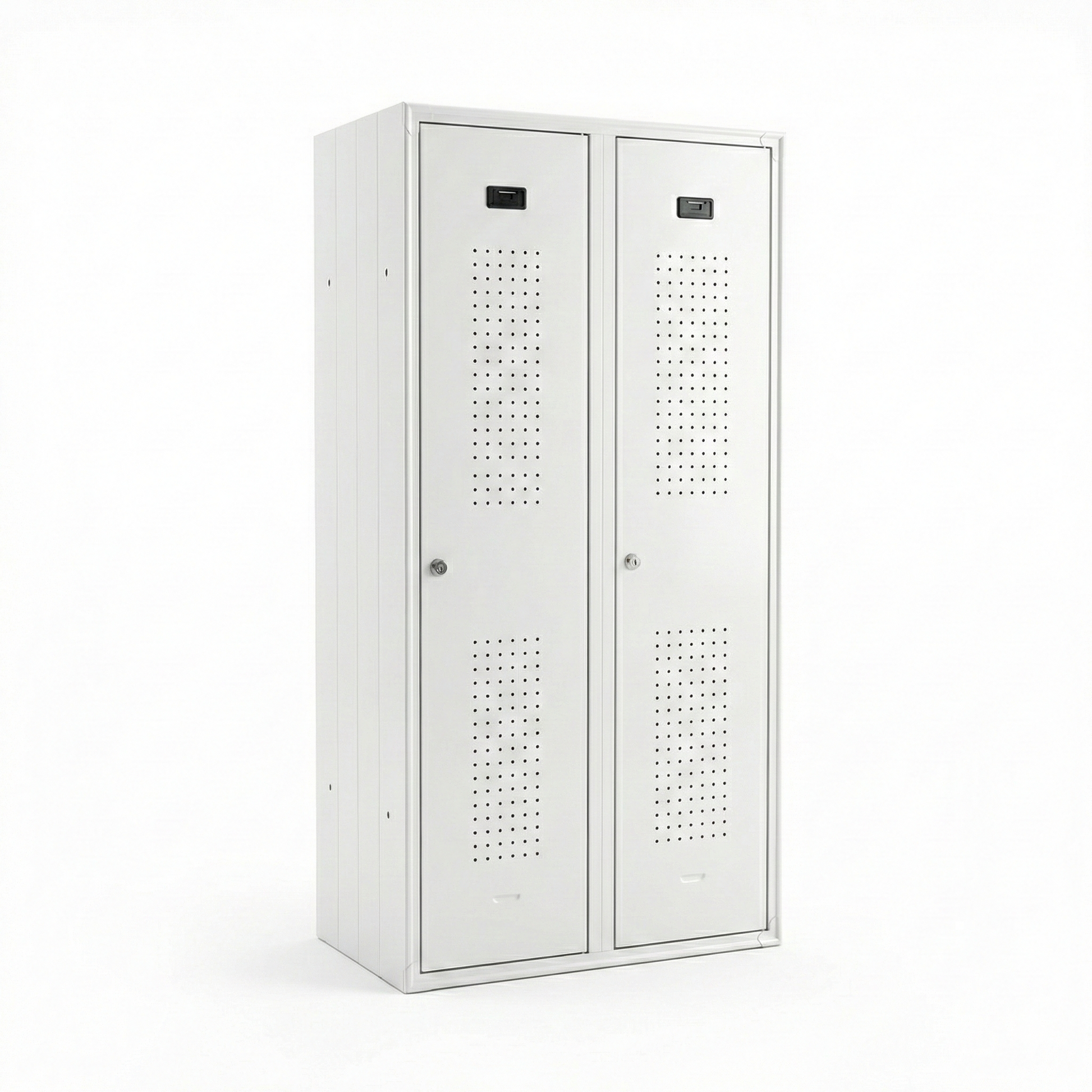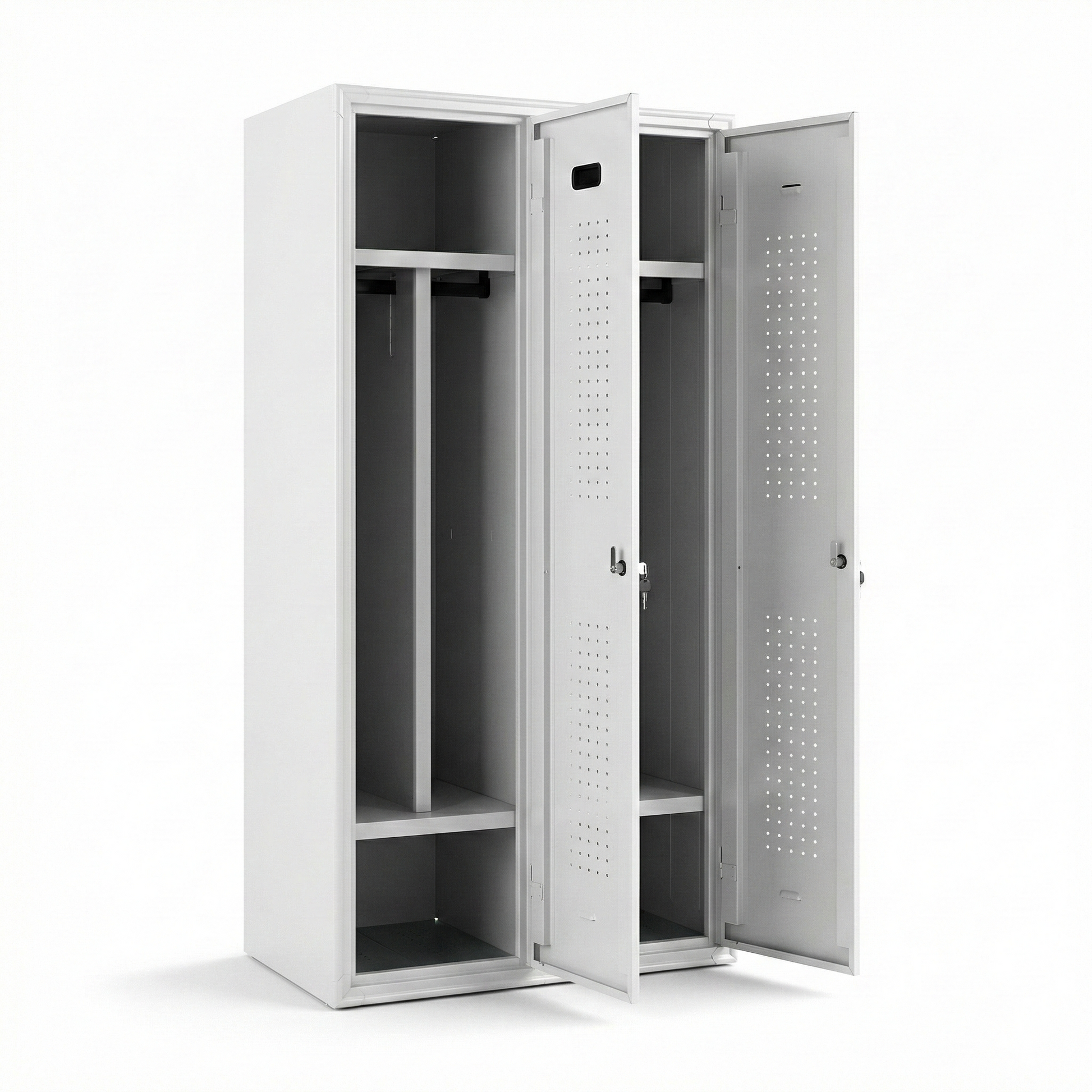 Praktičan garderobni ormarić s 2 vrata za uredno odlaganje radne opreme, odjeće i ličnih stvari. Ormarić je izveden kao čvrsta, industrijska konstrukcija sa ventilacionim perforacijama na vratima za bolju cirkulaciju zraka u garderobama i servisnim prostorijama.