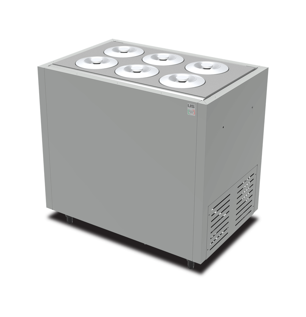 Ugradni rashladni modul za svježe pripremljen sladoled, predviđen za 6 cilindričnih posuda od 7,5 L uz dodatne pozicije za odlaganje. Statičko hlađenje, elektronska kontrola i ručno odleđivanje – namijenjeno profesionalnoj upotrebi.